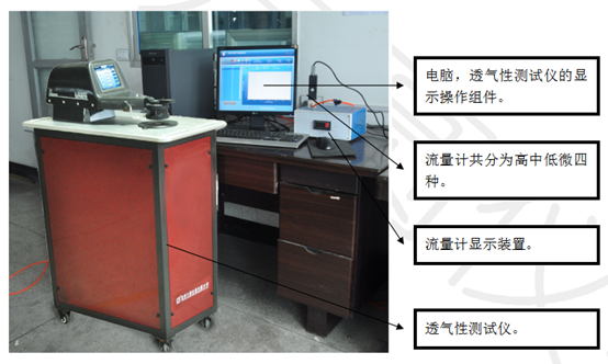工作原理:當試樣正反兩面達到規(guī)定的壓差時,測試單位時間內垂直流過試樣一定面積的氣流流量。
